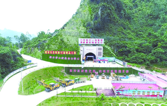 都安隧道全长15152米,是贵南高铁全线重点控制性工程,为Ⅱ级风险隧道。自2018年开工以来,全体参建人员先后克服了陡崖危岩发育、溶蚀裂隙发育、空气流通差等困难,积极探索危岩清理与爆破清理相结合、地质物探与小型工装相结合、洒水车与射流风机相结合等方式,以达到安全有序、增湿通气的效果,为喀斯特岩溶地貌地区长大隧道机械化智能化施工提供了良好样板。