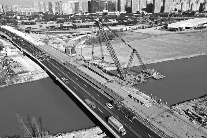 苏申内港线西段航道整治工程暨吴淞江工程(上海段)西段是上海市“一环十射”航道网络和太湖流域防洪治理规划的重要组成部分。G1503高速公路桥大修工程主要施工内容是在原址改建G1503高速公路桥,同步改造安亭立交匝道。该工程主线道路全长约1573米,新建主桥采用钢-混凝土组合连续箱梁结构体系,主跨138米。引桥基本采用30米标准跨径预制小箱梁结构。