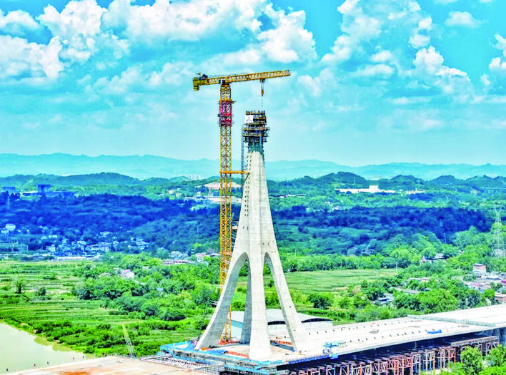 东西城市轴线是“成渝地区双城经济圈建设”的交通骨干路网工程,被誉为成都东西向的“天府大道”。此次封顶的沱江大桥为空间异型独塔双索面非对称混合梁斜拉桥。全长1010米的桥体中,455米主桥的混凝土主梁最宽处达79米,159米高的主塔相当于53层楼的高度。