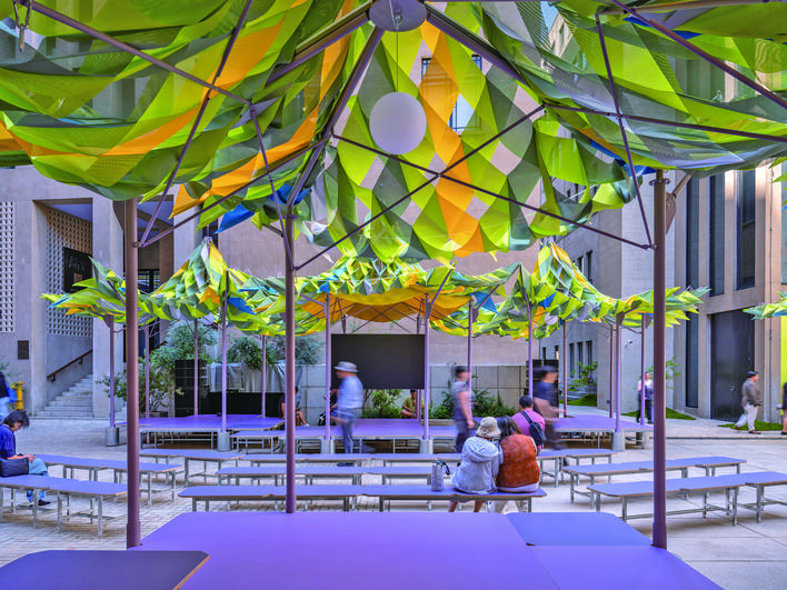 “上海野餐”邀请市民和观众以一种即兴、有趣且出乎建筑师和设计师预料的方式体验城市。本届建筑节的核心装置是由all(zone)设计的、覆盖博物院广场的轻质巨型篷顶。这并非是封闭的建筑,而是一个可活动的框架,可根据天气、活动需求变幻形态,为各种自发性的相聚、讨论和表演提供庇护的场所。all(zone)借助可重复使用的轻质篷顶与因地制宜的设计,构想了一个灵活、开放的框架,重新激活未被充分利用的城市空间。