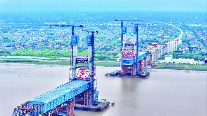 世界最大跨度公铁两用无砟轨道斜拉桥双主塔封顶