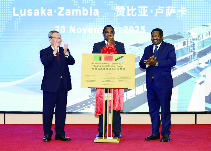 新华社消息 当地时间11月20日,国务院总理李强在卢萨卡同赞比亚总统希奇莱马、坦桑尼亚副总统恩钦比共同出席坦赞铁路激活项目开工仪式。