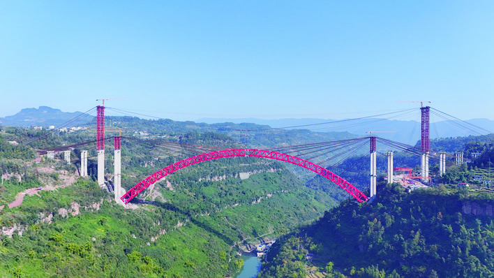 11月27日,世界最大跨度上承式钢桁拱桥——重庆武隆至两江新区高速公路凤来大溪河特大桥主拱合龙。