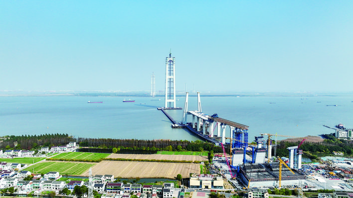 “从设计图纸到高塔矗立江心,从主塔首节段吊装到上横梁合龙,历时630多天,每一次吊装的精心组织,每一个节段的精准对接,都是团队攻坚克难的成果,更是中国桥梁技术向世界顶尖水平迈进的见证。”中交二航局张靖皋长江大桥项目技术负责人黄修平表示。