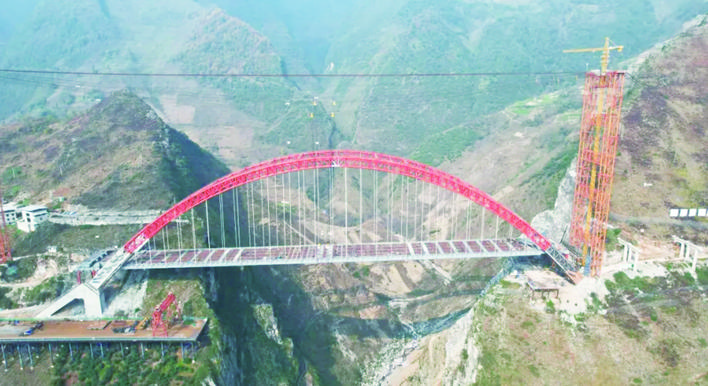 雷波大桥位于四川省凉山州雷波县,全长2440.91米,主桥为332.5米的中承式钢管混凝土拱桥,全桥钢结构共计5912吨。大桥地处复杂山区,桥位地形切割剧烈,需跨越一个深度达210米两岸坡度约45度的“V”形峡谷,在如此险峻的峡谷中完成精准“空中搭桥术”,其施工难度属国内同类桥梁前列。
