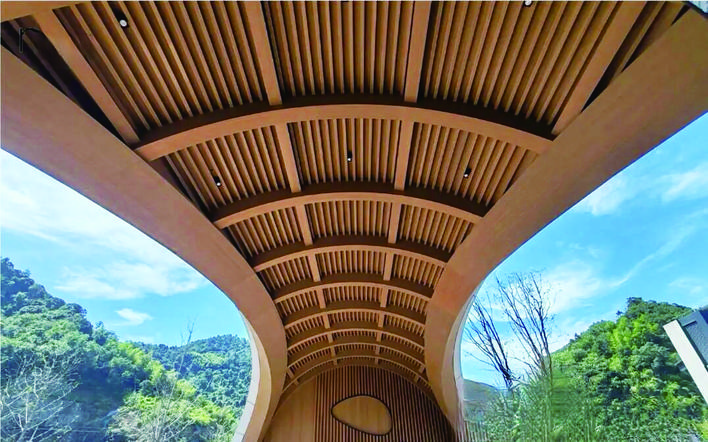 MOSO无限竹在C40+项目中刷新着行业标杆,其物理弯曲技术实现7米纯净弧面,精度超越传统工艺;全生命周期碳排较混凝土直降76%;轻质预制单元减少85%山体开挖,守护新安江生态脉络。当游客潜入竹穹之下,触摸温润池壁的瞬间,是一种舒心的体验,也是一种与自然的深情交融。