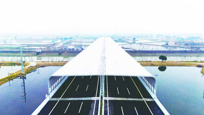 冬日暖阳下,双柳长江大桥北岸接线工程上,一个银色的全封闭式保护罩闪闪发光。