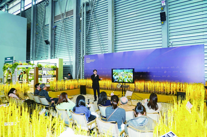 沙龙设在X-1区域,一个名为“自然围合”的场域。在冷峻的工业展馆内,一片金色麦浪构建出兼具仪式感与松弛感的对话空间。就在这片麦浪中央,来自多家设计企业的嘉宾,从技术体系、数字化工具、适老设计、社区营造等不同维度,分享了他们对“好房子”的理解与实践。